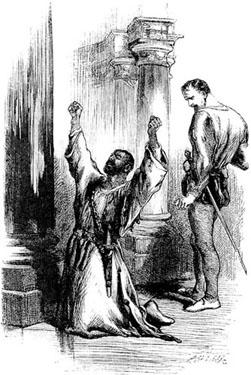 你要是故意捏造谣言,毁坏她的名誉,使我受到难堪的痛苦,那么你再不要祈祷吧;放弃一切恻隐之心,让各种骇人听闻的罪恶丛集于你罪恶的一身,尽管做一些使上天悲泣、使人世惊愕的暴行吧,因为你现在已经罪大恶极,没有什么可以使你在地狱里沉沦得更深的了。